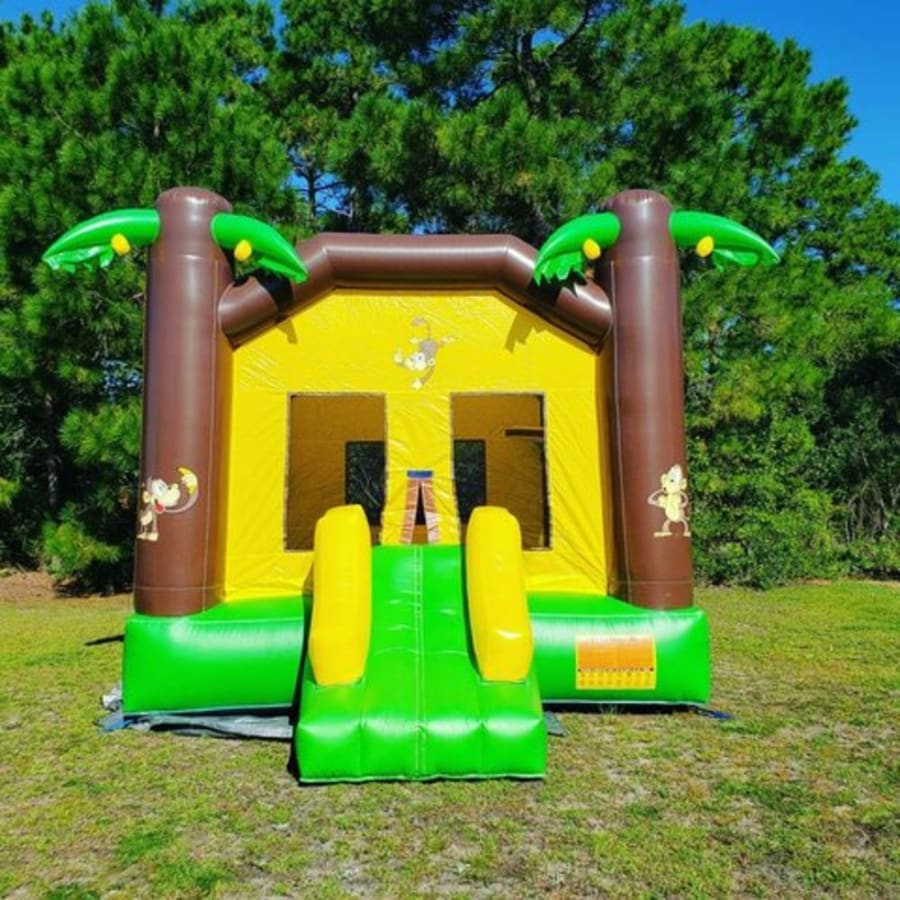 Our jungle themed bounce house will be the best feature for any birthday party. It is decorated with pictures of monkeys and bananas and can make any mini George of the Jungle ecstatic! Our jungle bounce house features a 13'x13' bounce house with a green and brown color scheme, basketball hoop, and a small slide to get in and out of the unit