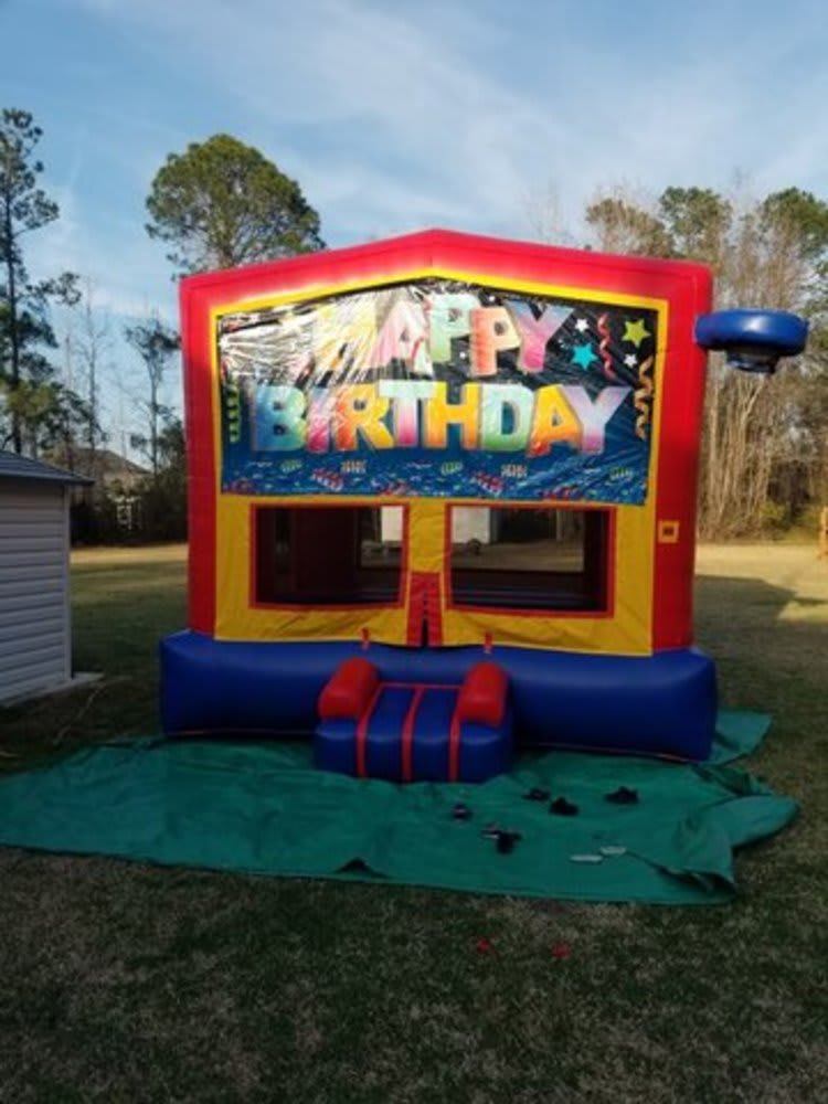 This standard bounce house is sure to be a hit at every party! This unit has a large bounce space and even has a basketball hoop. Birthday banner not included but can be added for an additional charge.